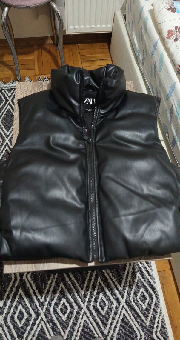 Fermuarlı, yüksek yakalı ve siyah deri kumaştan yapılmış, sokak stiline uygun, vücuda oturan kadın yelek. Günlük kullanıma uygundur. Small bedenler çok rahat giyer