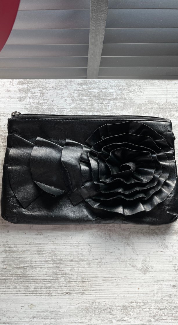Siyah deri portföy cüzdan koyu renkli floral fırfır detaylarıyla günlük kullanıma uygun goth Paris tarzını yansıtıyor.