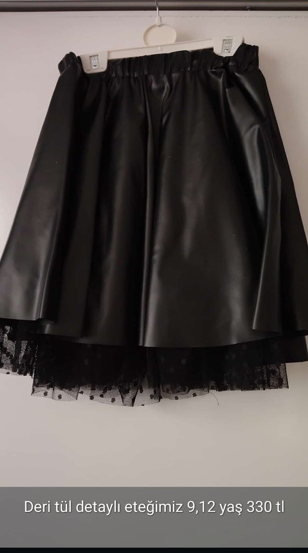 Siyah deri malzemeden üretilmiş, fırfırlı ve bol kesim kız eteği. Gotik ve avangard tarzda şık bir görünüm sunar.