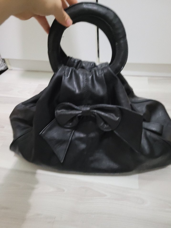 Yuvarlak saplı siyah deri çanta, fiyonk detayıyla gotik ve Parisli avangart tarzda, parti için uygun.