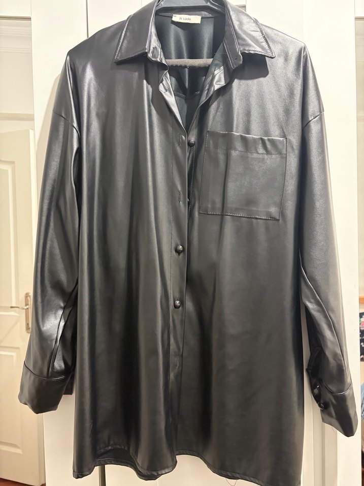 Siyah deri, düğmeli, notalı yakalı, uzun kollu ve bol kesim midi ceket. Ofis için uygun, rahat bir tarz sunar.