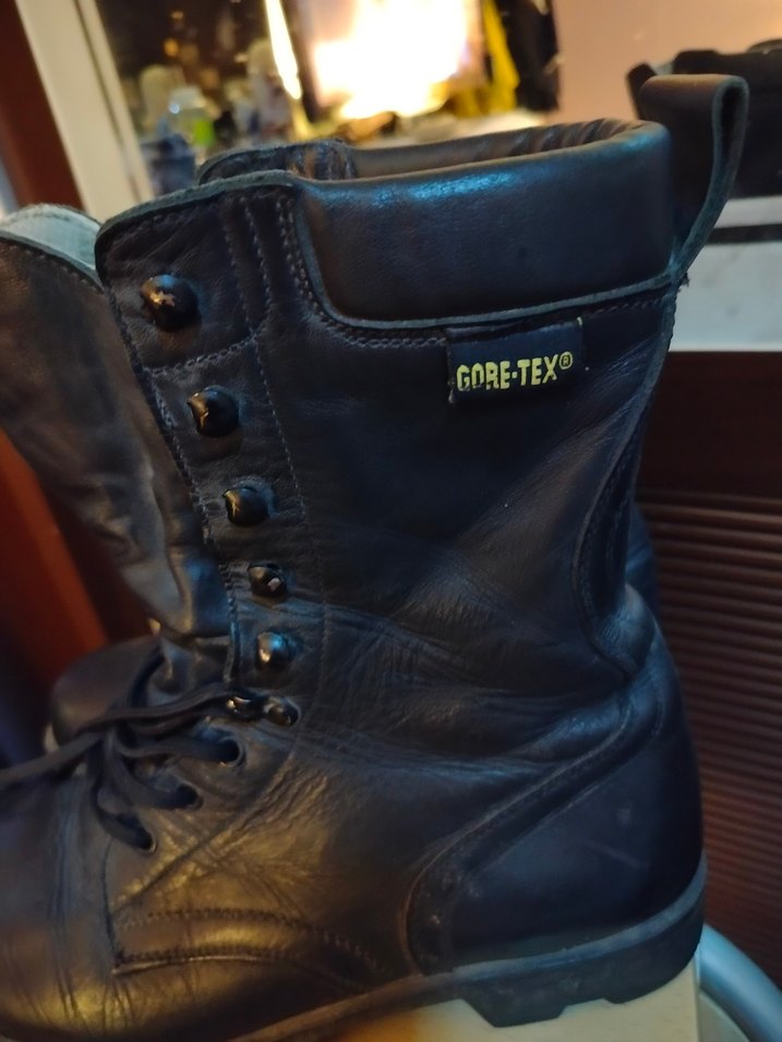 GORE-TEX® teknolojili siyah deri erkek bot, tokalı detaylar ve koyu kamuflaj desenine sahip. Günlük kullanıma uygun grunge punk ve goth tarzında.