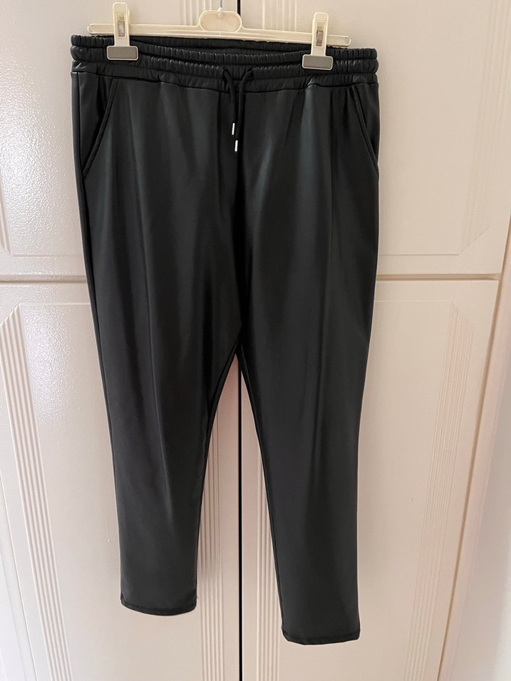 Siyah deri görünümlü, içi polarlı, kemerli ve bol kesim midi boy pantolon, günlük rahatlık için yan ceplidir. Sokak stiline uygun sade tasarım sunar.