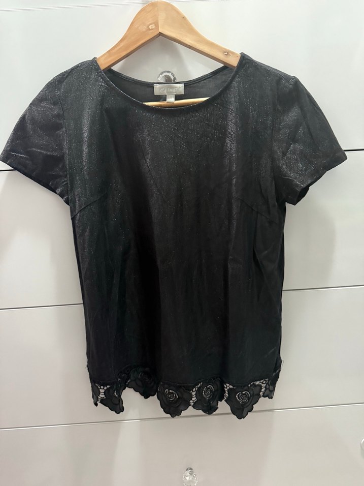 Kısa kollu, yuvarlak yakalı siyah deri görünümlü bluz, dantel detaylı etek ucu ile. Salaş kesim ve midi boyda, romantik akşamlar için uygun.