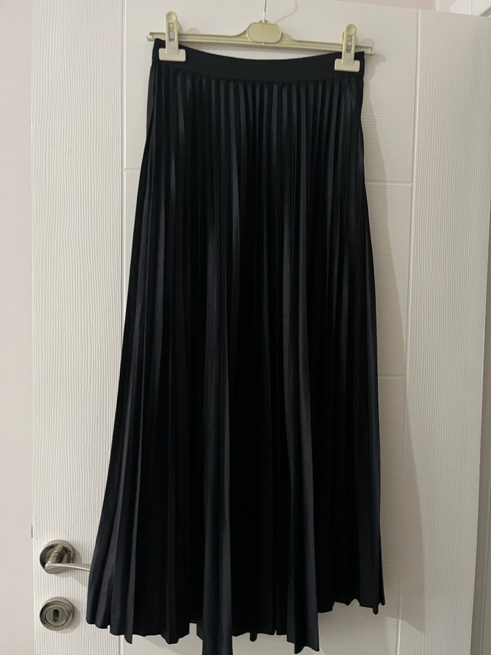 Siyah uzun pileli kadın eteği, sentetik kumaştan ve bol kesimlidir. Gotik ve avangart tarzlara uygundur, ofis için idealdir.