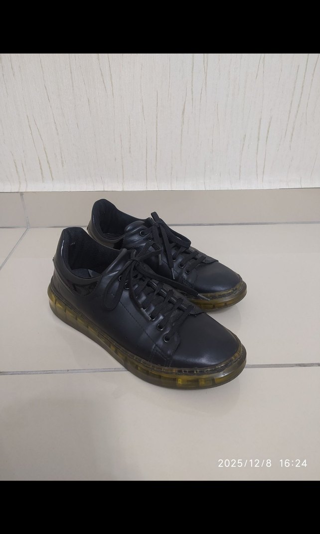 Siyah renkli,kadın sneakers. Kauçuk tabanlı, desen içermeyen, günlük kullanıma uygun rahat sokak stili ayakkabı. 38 Numara Şanzelize Marka) iyi durumda.Taban yapısı ve ayakkabı gövdesi sağlamdır. Siyah rengi sayesinde hem günlük kot pantolonlarla hem de daha şık, spor-şık (smart-casual) kombinlerle rahatlıkla kullanılabilir. Kalın tabanı, ayağa ekstra konfor sağlarken boyunuzu da hafifçe uzatır. Deri görünümlü yüzeyi sayesinde kolayca silinerek temizlenir.
