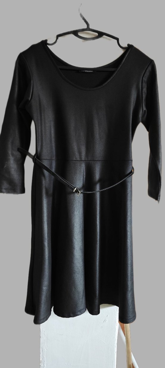 Siyah Deri Görünümlü Kemerli Kadın Elbise
