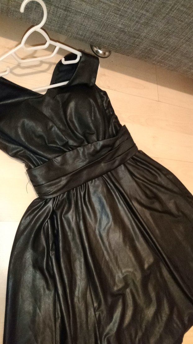 Siyah, deri görünümlü kısa elbise, V yakalı ve askılı, drapeli tasarımıyla gotik parti şıklığı sunar.