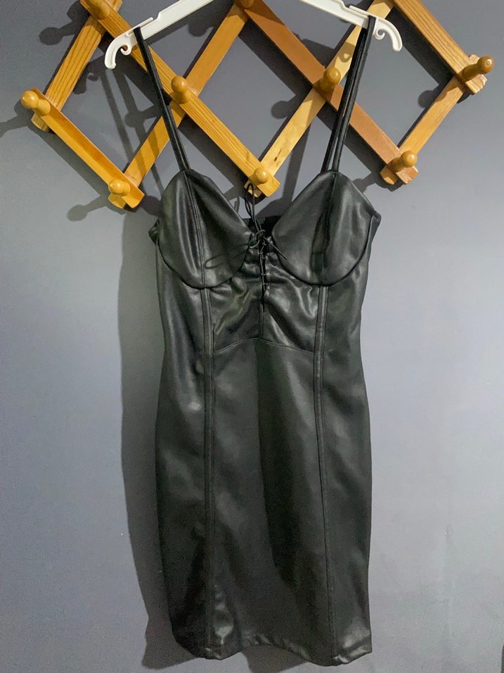 Siyah deri görünümlü, ince askılı, halter yaka bel detaylı, gövdeyi saran midi boy goth elbise.