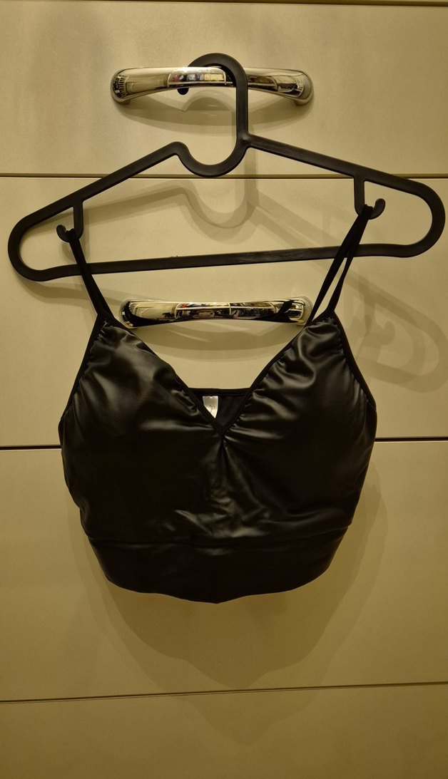 Siyah ince askılı mini bustiyer. S/M uyumludur. cikarilabilir pedleri mevcuttur. hic kullanilmadi