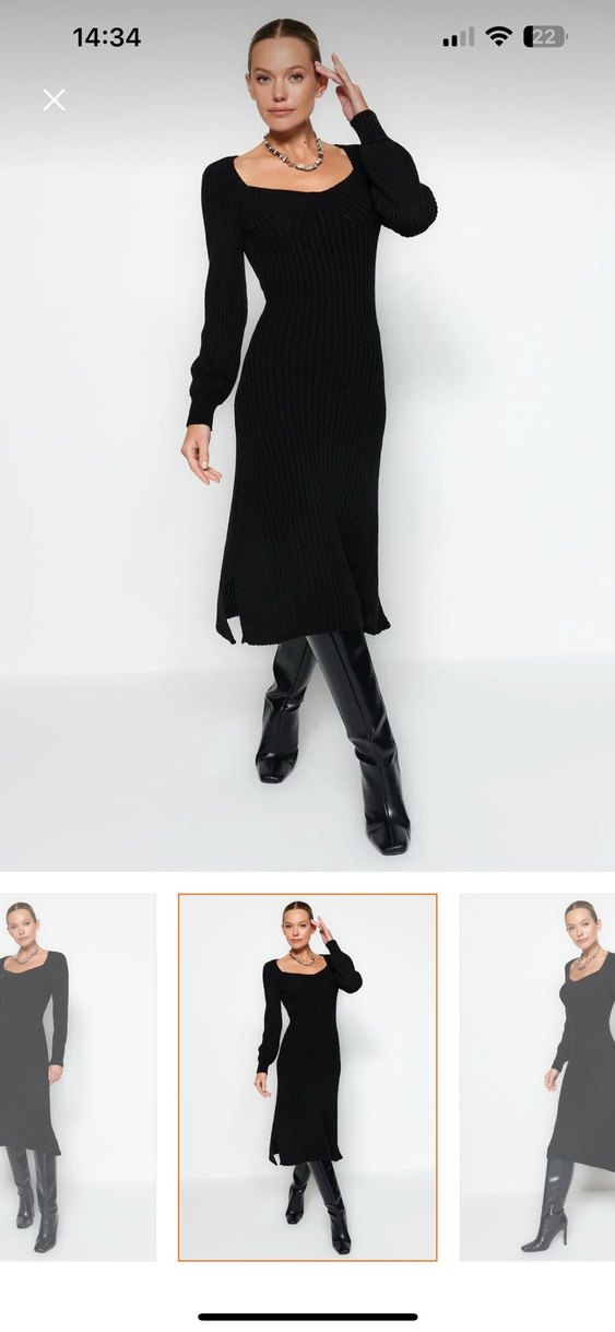 Yüksek yakalı, uzun kollu ve deri görünümlü kumaştan yapılmış siyah, vücuda oturan uzun triko elbise. Günlük kullanıma uygun, zahmetsiz şıklık sunar.