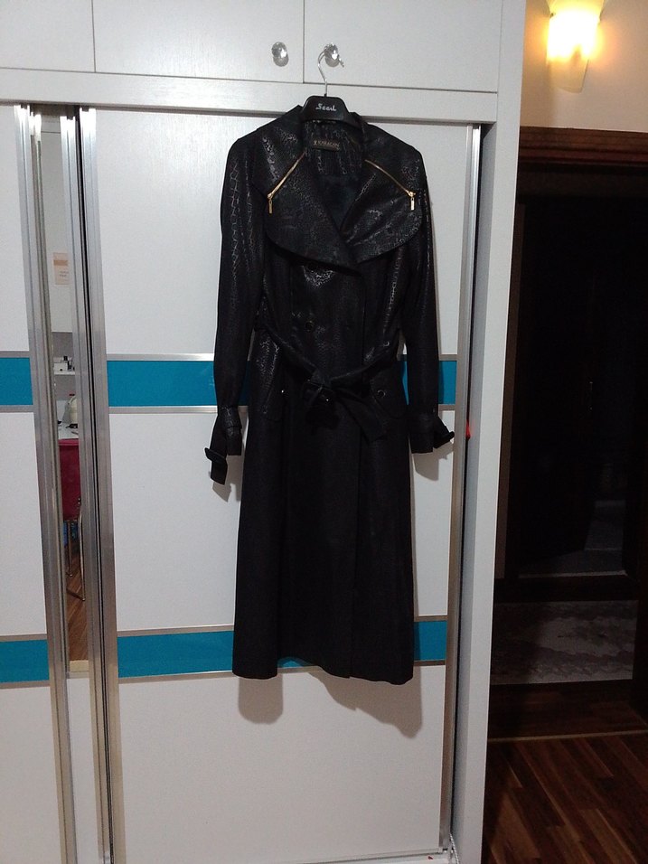 Bu siyah deri görünümlü trençkot pardesü, yılan desenli, yakalı ve kayışlı kollu, kemerli ve regular fit kesimlidir. Gotik ve Paris tarzını ofis şıklığıyla buluşturur.