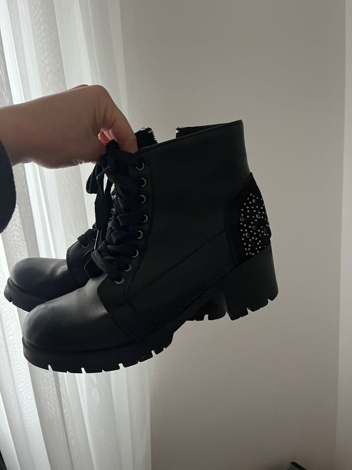 Siyah deri blok topuklu botlar, tokalı detaylar ve gotik tarzda tasarlanmıştır. Günlük kullanım için uygun, rock punk havası taşıyor.