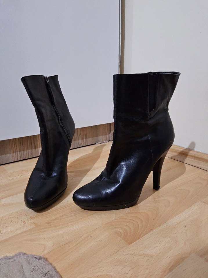 Siyah deri, Nine West topuklu bot. Minimalist goth tarzı, ofis kullanımına uygun. Fotoğrafta görünen gibi iç kısmında soyulmalar var.