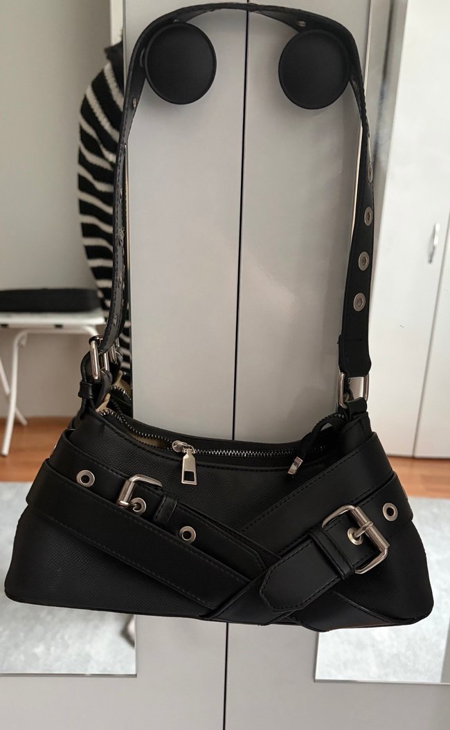Tokalı kayışlara sahip siyah deri goth çanta, koyu zebra desenli. Günlük kullanım için trend belirleyicilere uygun.