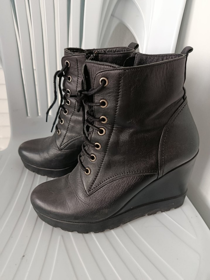 Siyah deri malzemeden yapılmış, dolgu topuklu goth tarzı kadın botlarıdır. Kemer detayları ile günlük kullanıma uygundur.