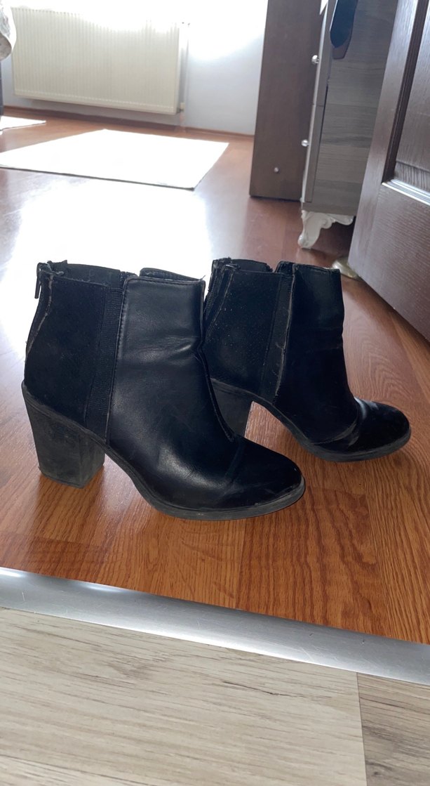 Siyah deri, tokalı, blok topuklu goth tarzı kadın botu, günlük kullanıma uygun.