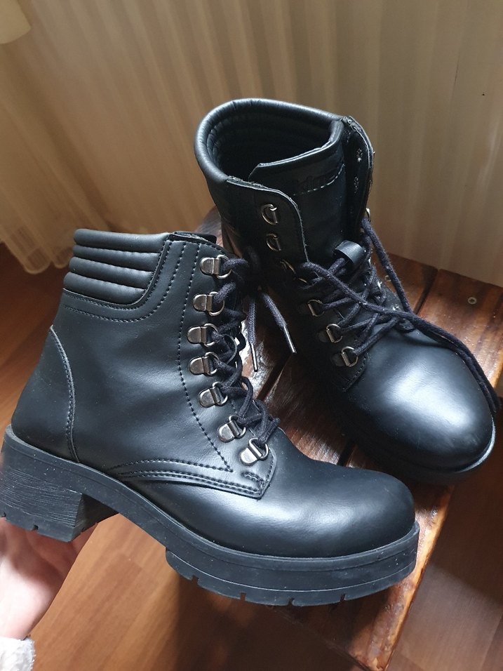 Siyah deri goth tarzı kadın botları, kalın topuklu ve tokalı detaylara sahip, günlük kullanıma uygundur. çok ufak bir ön tarafında zedelenme var görsellere ekledim başka kusuru yoktur
