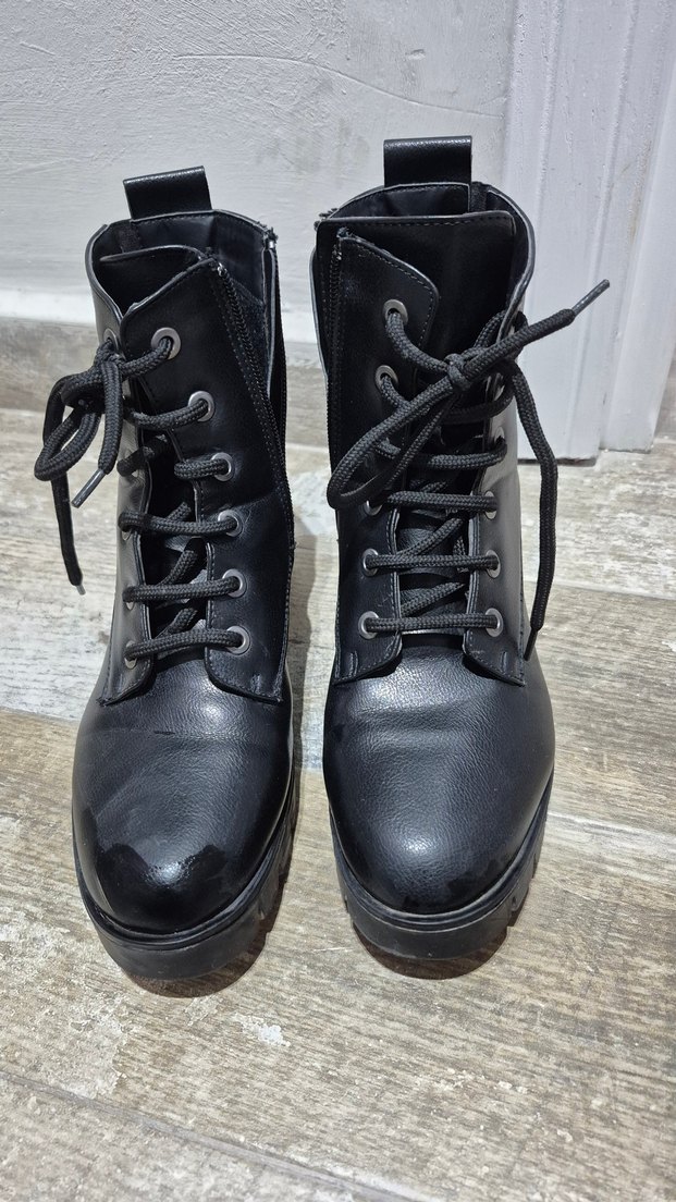 Siyah deri, blok topuklu, tokalı ve bağcıklı goth kadın botları. Desensiz tasarımıyla günlük kullanımda rock punk havası katıyor.