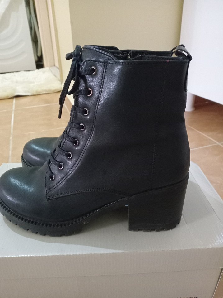 Siyah deri goth botlar, platform topuklu ve bağcıklı. Koyu renkli ve desen içermeyen rock punk tarzı için uygun.