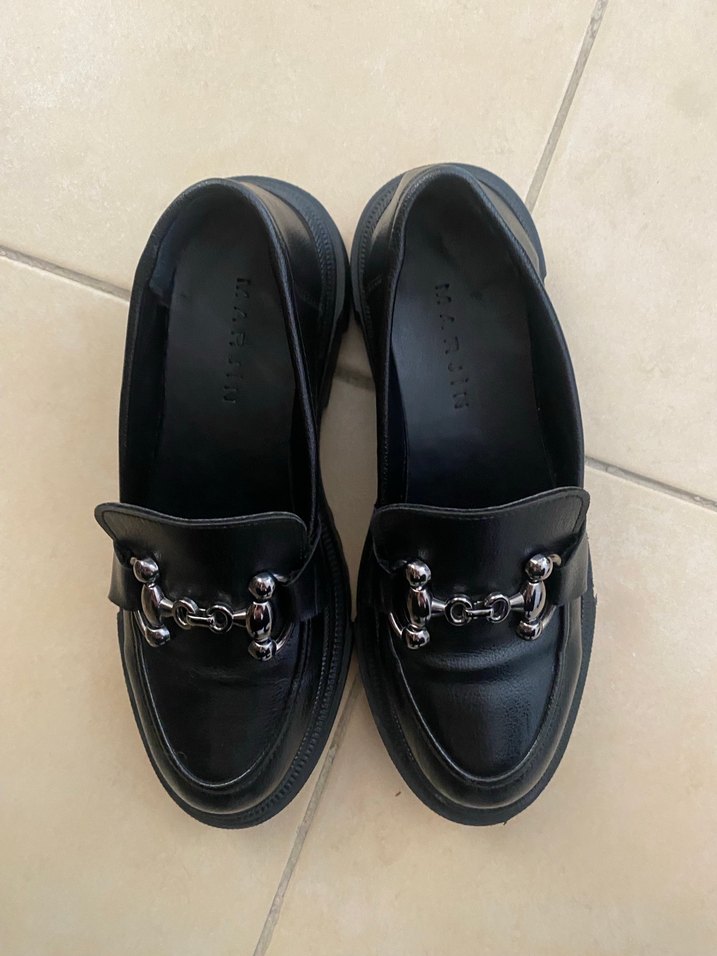 Siyah deri kadın loafer, platform topuklu ve tokalı detaylı, Parisli goth tarzını yansıtıyor.