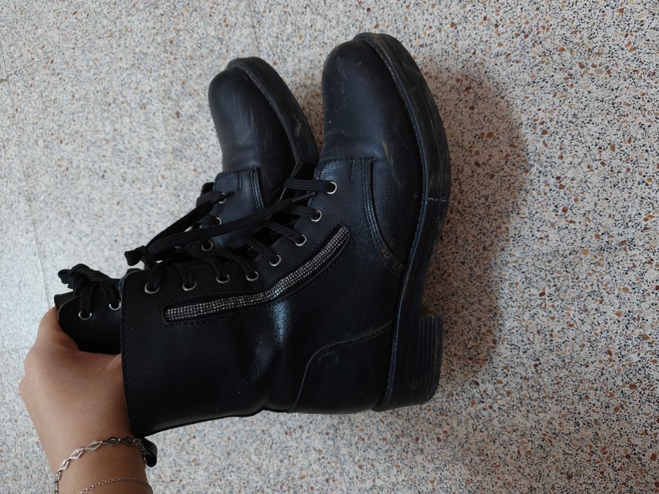 Siyah deri goth botlar, kalın topuklu ve tokalı detaylara sahip, günlük kullanım için uygun rock punk tarzında. Desensiz ve koyu renkte.