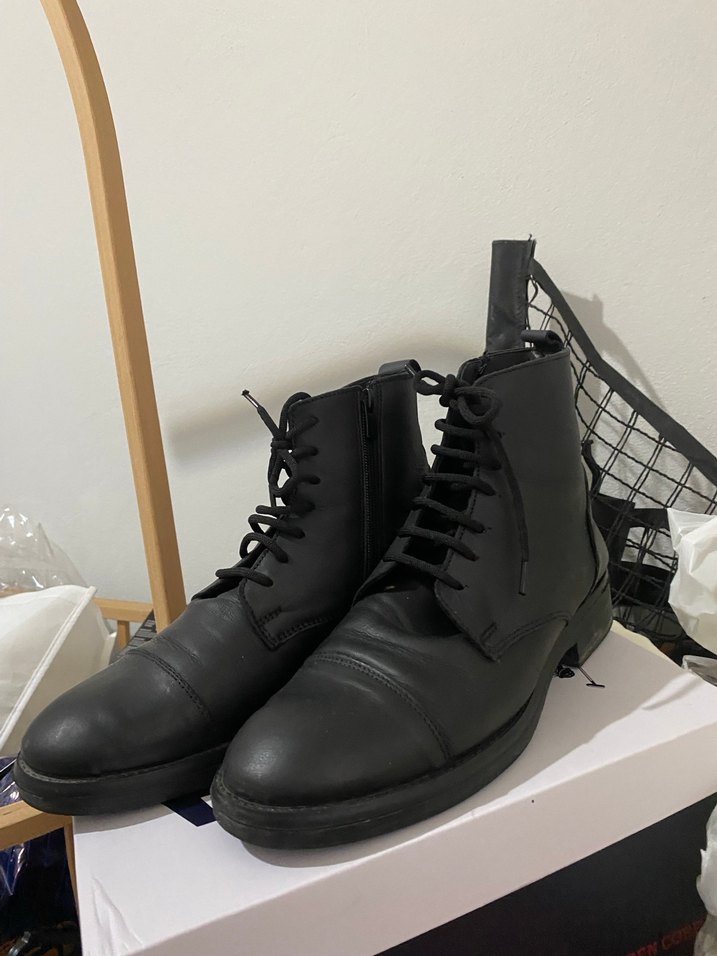 Siyah deri goth tarzı kadın botları, stiletto topuklu ve tokalı detaylara sahip. Parisli avangart dokunuşuyla günlük kullanıma uygun.