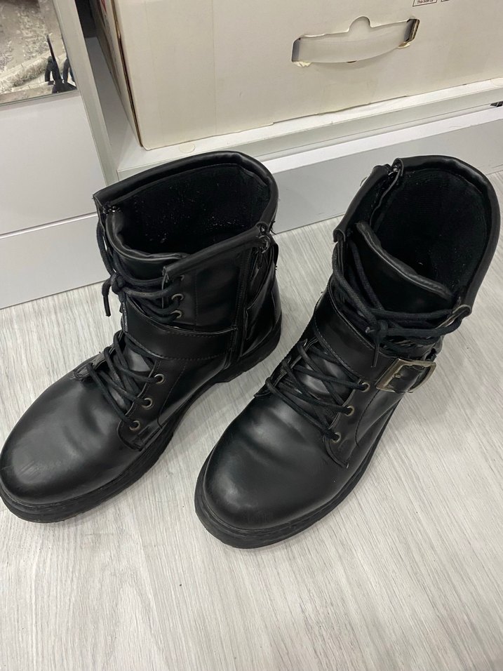 Siyah deri, gotik tarzı kadın botları; tokalı ve bağcıklı, günlük rahat kullanıma uygun.