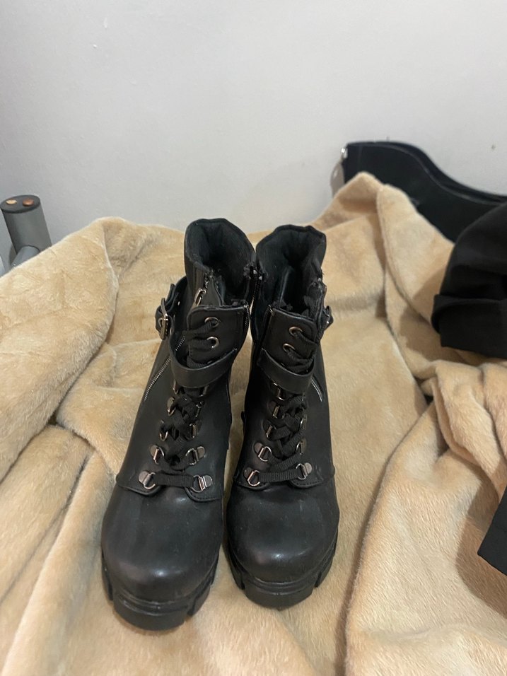 Siyah deri, dolgu topuklu, tokalı ve gotik tarzda kadın botları. Günlük kullanım için uygun, rock punk havası verir.