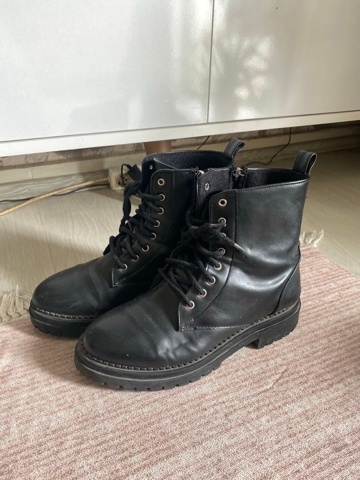 Siyah deri goth tarzı, tokalı ve blok topuklu botlar, günlük kullanıma uygun.