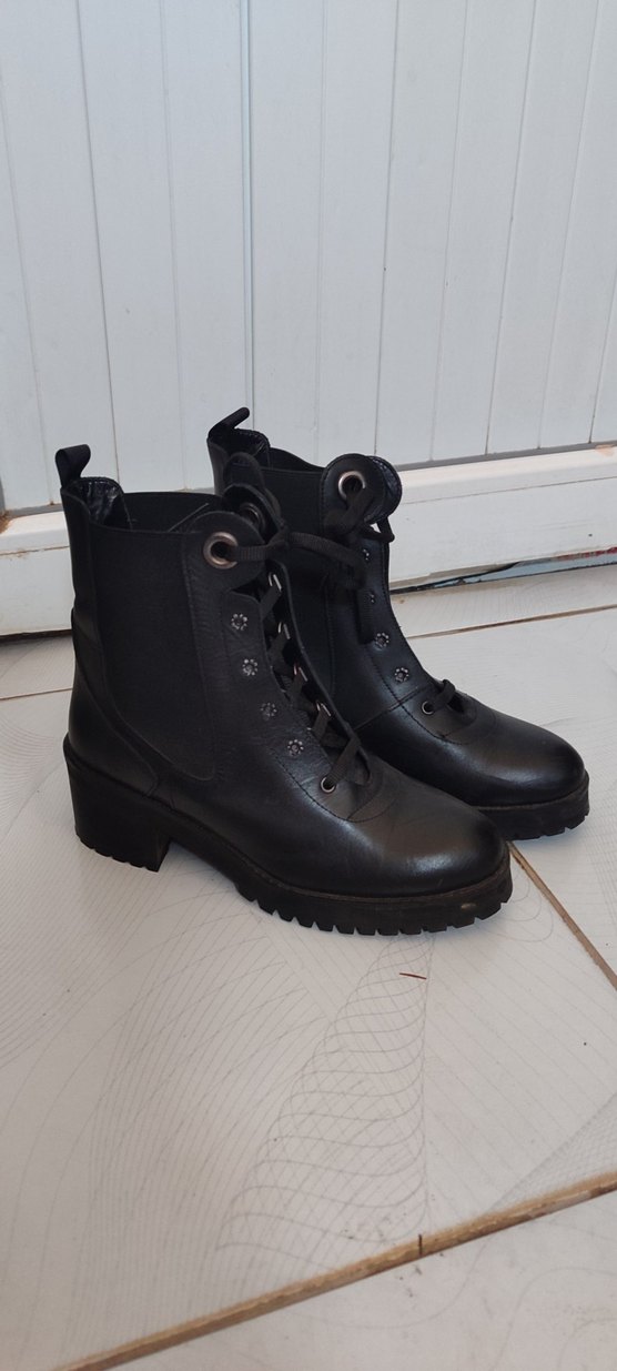 Siyah deri kadın botlar, tokalı ve bağcıklı detaylara sahip blok topuklu, günlük kullanım için goth ve punk tarzını yansıtır. bir defa giyildi