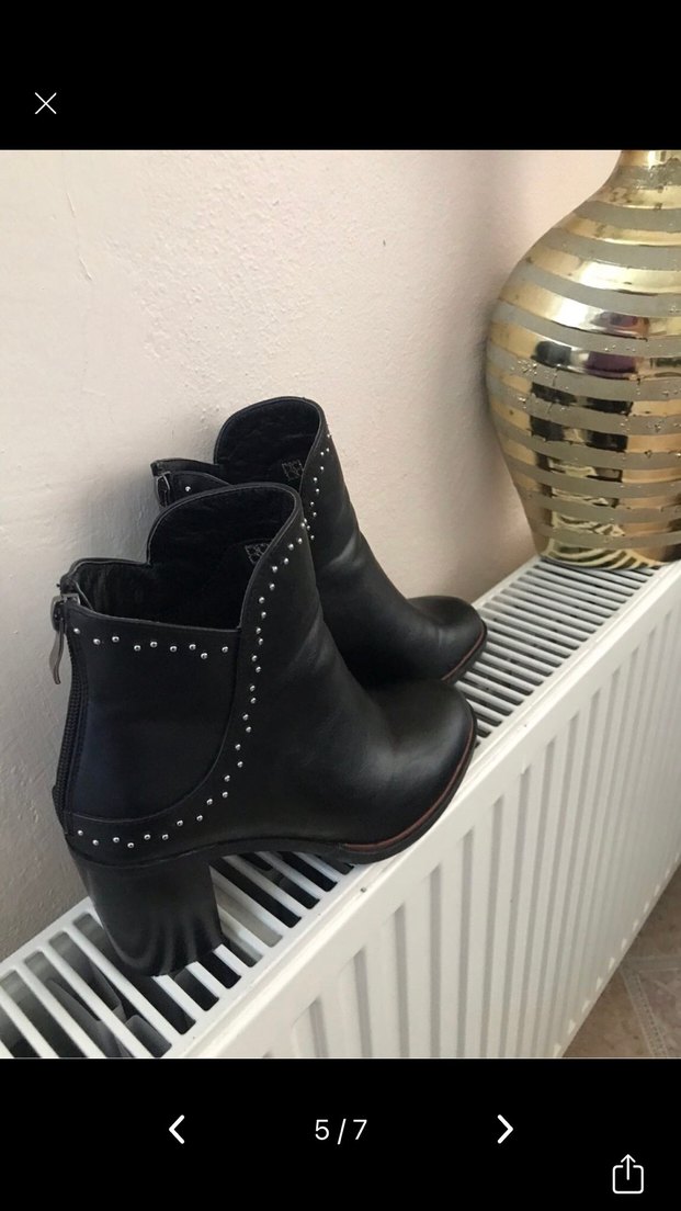 Siyah deri kadın botlar, blok topuklu ve tokalı detaylara sahip, perçin süslemeleriyle trend gündelik stil için uygundur. Butigo 37 numara tertemiz sayılı giyildi