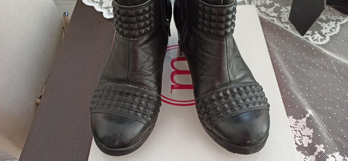 Siyah deri, blok topuklu gotik tarzda, tokalı detaylara sahip botlar. Günlük kullanım için uygun, rock punk havası katıyor. Yuvarlak burunlu bir bot olup tabanı kalın lastik olduğu için soğuğu geçirmez. Tek ve kalın topuklu bir bottur..Temiz kullanılmıştır.40 numara dur..