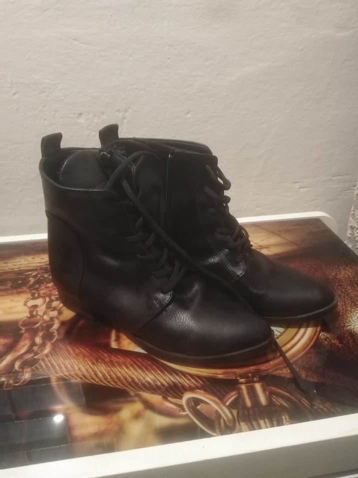 Siyah deri gotik kadın botları, kalın topuklu ve tokalı detaylara sahip, günlük kullanım için uygun koyu renkte ve desensiz.