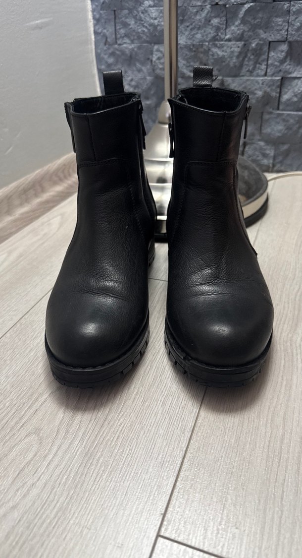Siyah gerçek deri, blok topuklu, tokalı gotik tarzda kadın botları. Günlük kullanıma uygun, şık ve rahat.