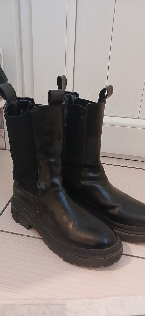Siyah deri, gotik tarzda, tokalı ve blok topuklu kadın botu, sokak modasına uygun. hiçbir kusuru yoktur. 2 3 defa giyilmiştir. saklama koşullarından dolayı bilek kısmında burkulma gözüküyor ama giyince düzelecek