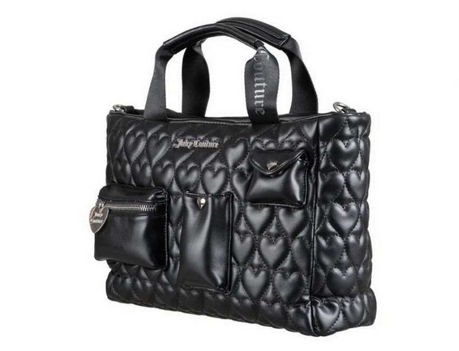 Siyah deri çanta, kalp desenli kapitone ve çoklu fermuarlı ceplerle gotik stil ve günlük kullanımı bir araya getirir.