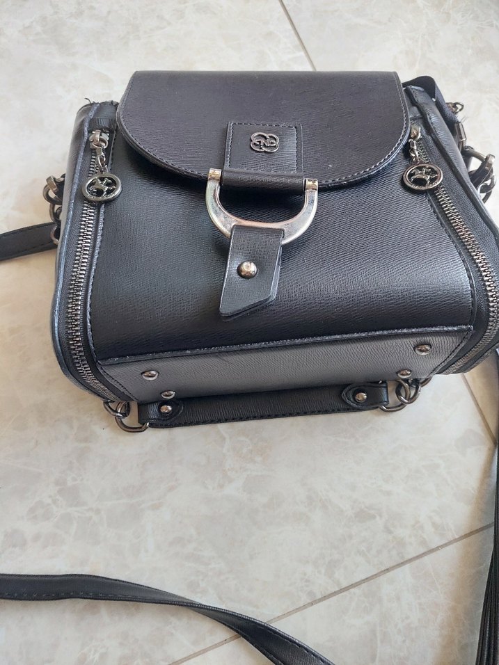 Siyah deri, tokalı ve baskılı detaylara sahip gotik tarzda kadın çanta. Klasik şıklık için uygun, günlük kullanıma ideal.