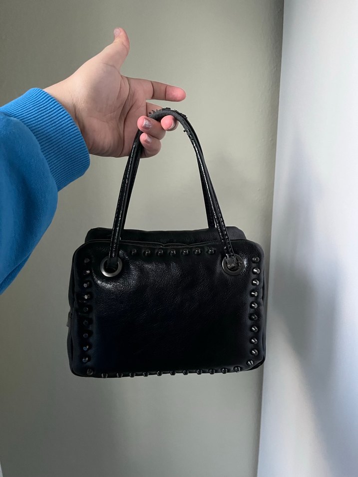 Siyah deri gotik tarzda, fermuarlı ve perçin detaylı kadın çantası, günlük kullanıma uygun koyu renkli şık tasarım. Sap kısmında deformeler var uzun askısı mevcut