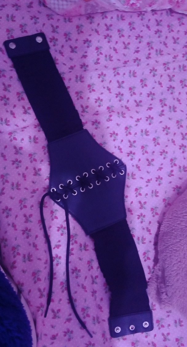 Bu kadın kemeri, koyu mor deri malzemeden yapılmış ve bağcık detaylı tokasıyla gotik ve punk tarzlara uygundur.