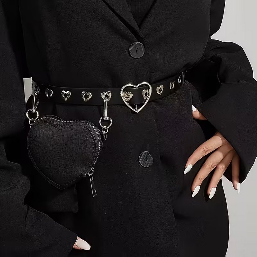 Siyah deri kemer, kalp şeklinde tokası ve halkaları ile gotik stile uygun küçük kalp çantası içerir.