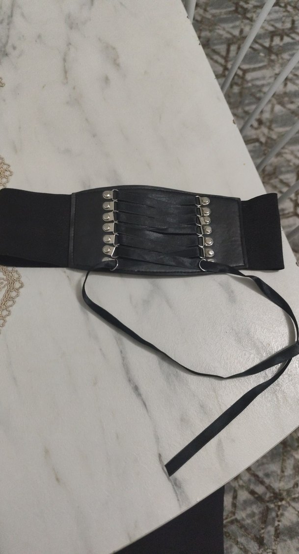 Bu siyah deri kemer, gotik tarzda, kemerli tasarımı ve gümüş detaylarıyla şık ve avangart bir görünüme sahiptir.