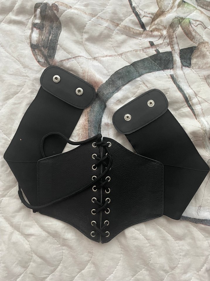 Ön kısmı bağcıklı ve çıtçıtlı siyah deri gotik kemer, modaya uygun avangart tarzda kemerli tasarıma sahip.