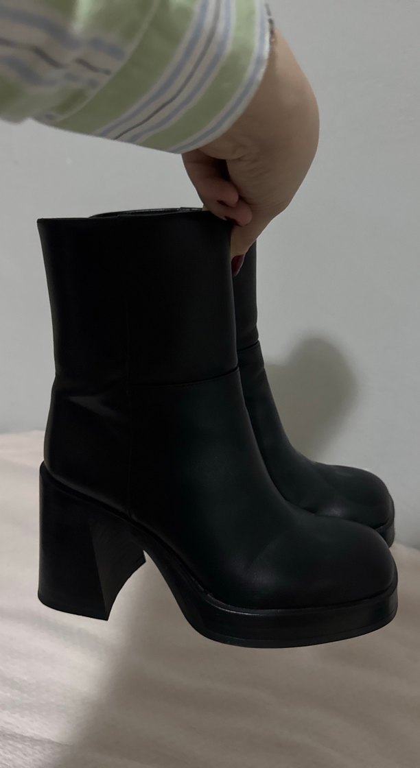 Siyah deri kadın bot, platform topuklu ve tokalı detaylarla cesur gotik stile sahip.