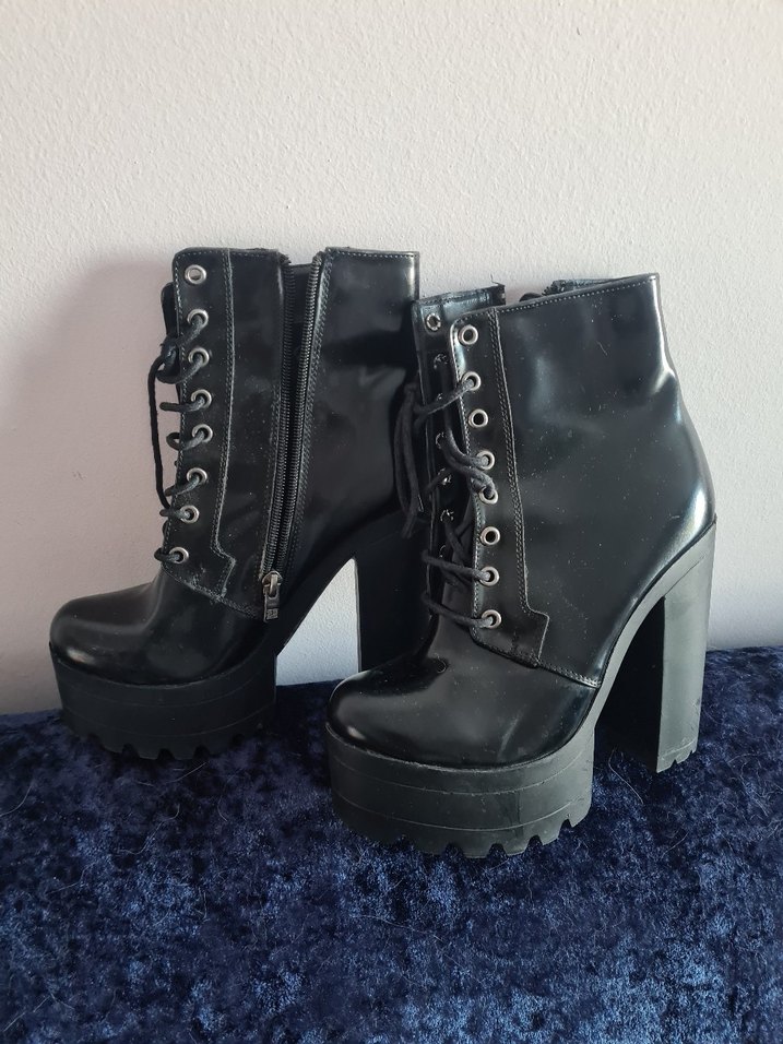 Siyah rugan gotik botlar, platform topuklu ve tokalı detaylara sahip. Bağcıklı ön ve yan fermuarlı, günlük kullanım için uygun. topuk boyu 12 cm .içi Polarlı.