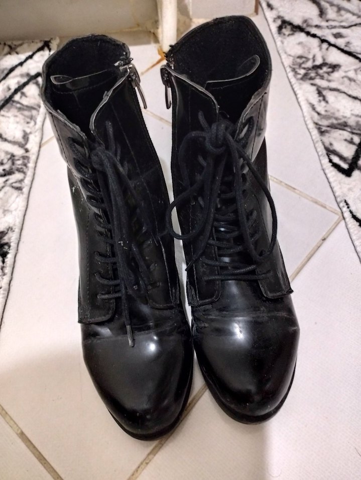 Siyah deri, stiletto topuklu gotik botlar, bağcıklı ve tokalı detaylarla rocker punk tarzı için uygun. Düz ve koyu renkte.
