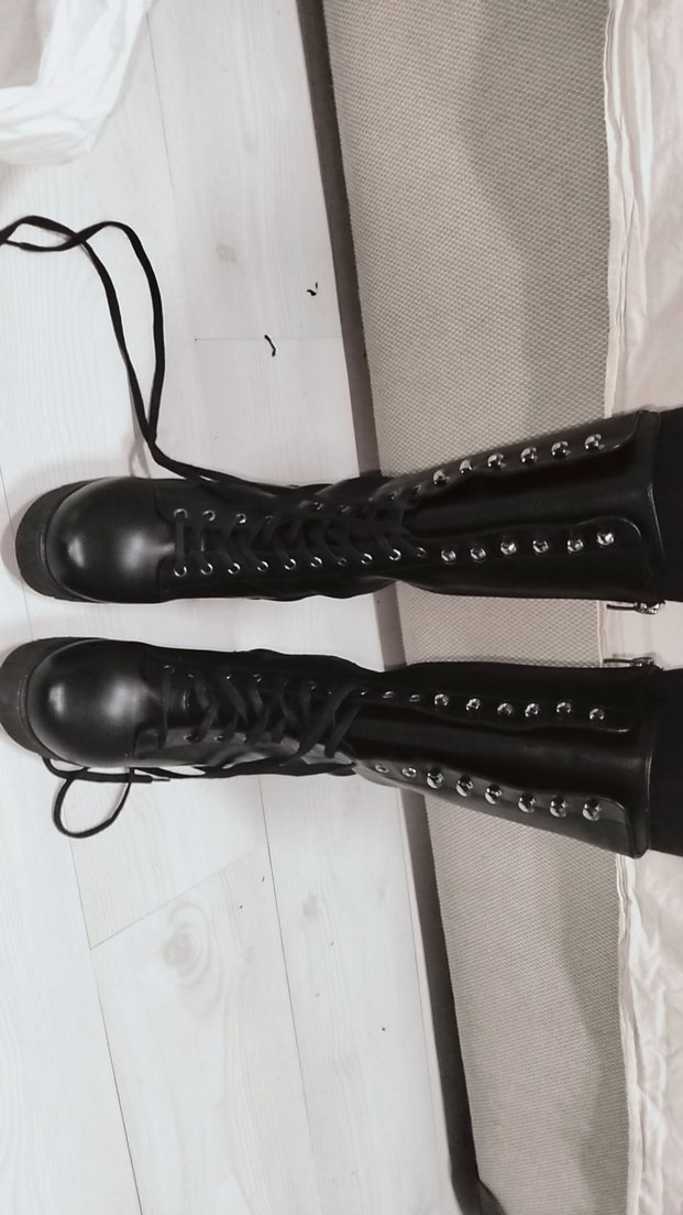 Siyah deri gotik botlar, stiletto topuklu, tokalı ve bağcıklı tasarıma sahip. Rock punk tarzı için uygun.