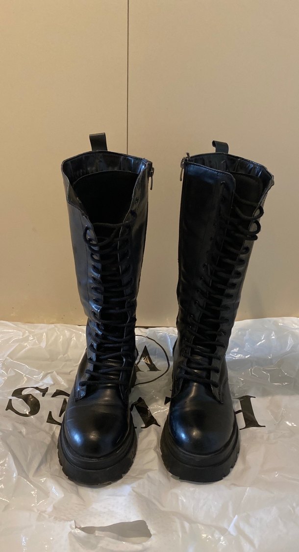 Siyah deri gotik stiletto topuklu, bağcıklı ve tokalı detaylara sahip botlar. Moda tutkunları için günlük kullanımda şık seçim.