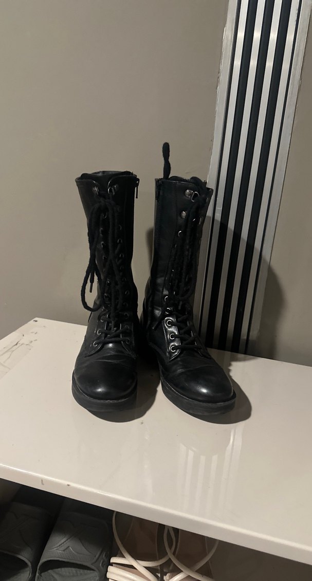 Siyah deri gotik botlar, stiletto topuklu ve tokalı detaylara sahip, günlük kullanım için uygun rock punk tarzında.