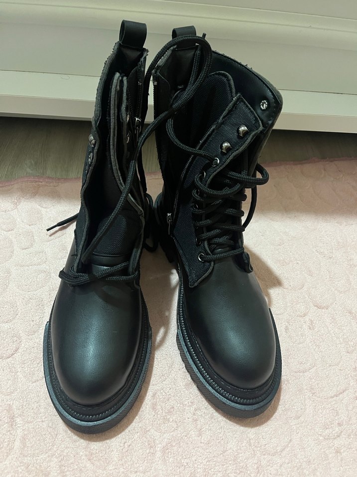 Siyah deri kadın botu, topuklu, bağcıklı ve tokalı detaylarla gotik tarzda, şık ve rahat postal bot kullanıma uygun.